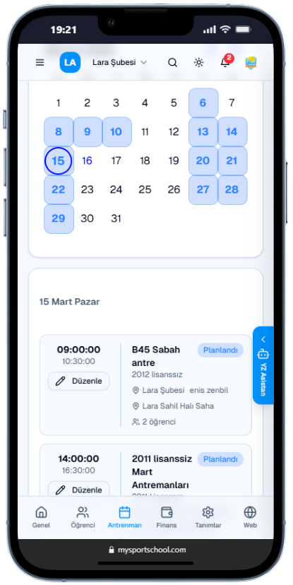 Öğrenci kayıtları, aidat takibi, antrenman programları, yapay zeka asistanı ve daha fazlası. Spor okulları için tasarlanmış tam kapsamlı yönetim platformu.